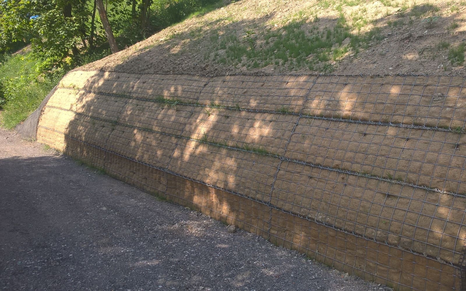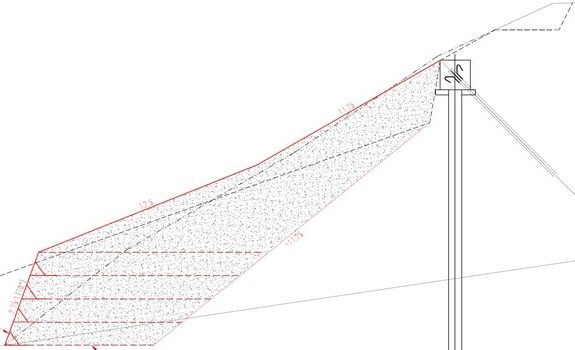 Vzhľadom k nedostatku miesta bola geometria konštrukcie navrhnutá na prvých 2 m výšky v sklone 70° s nadnásypom v sklone 1:2,5 plynule prechádzajúcim do sklonu 1:1,75.