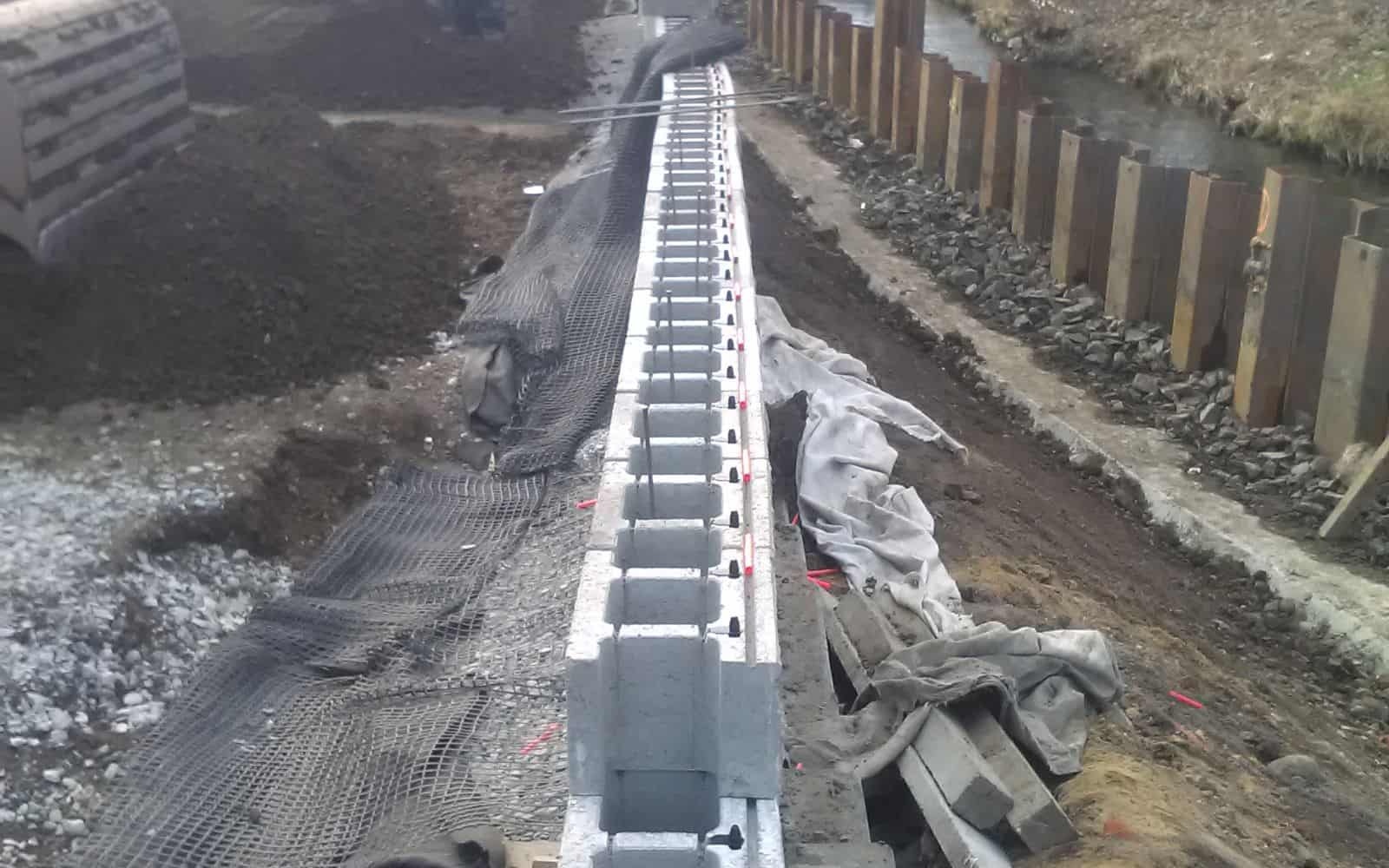 V rámci výstavby nového úseku dvoupruhové komunikace navazující na silnici I/62 a I/13 v části obce Děčín - Vilsnice byla navržena opěrná zeď z vyztužené zeminy s lícem z betonových tvarovek.
