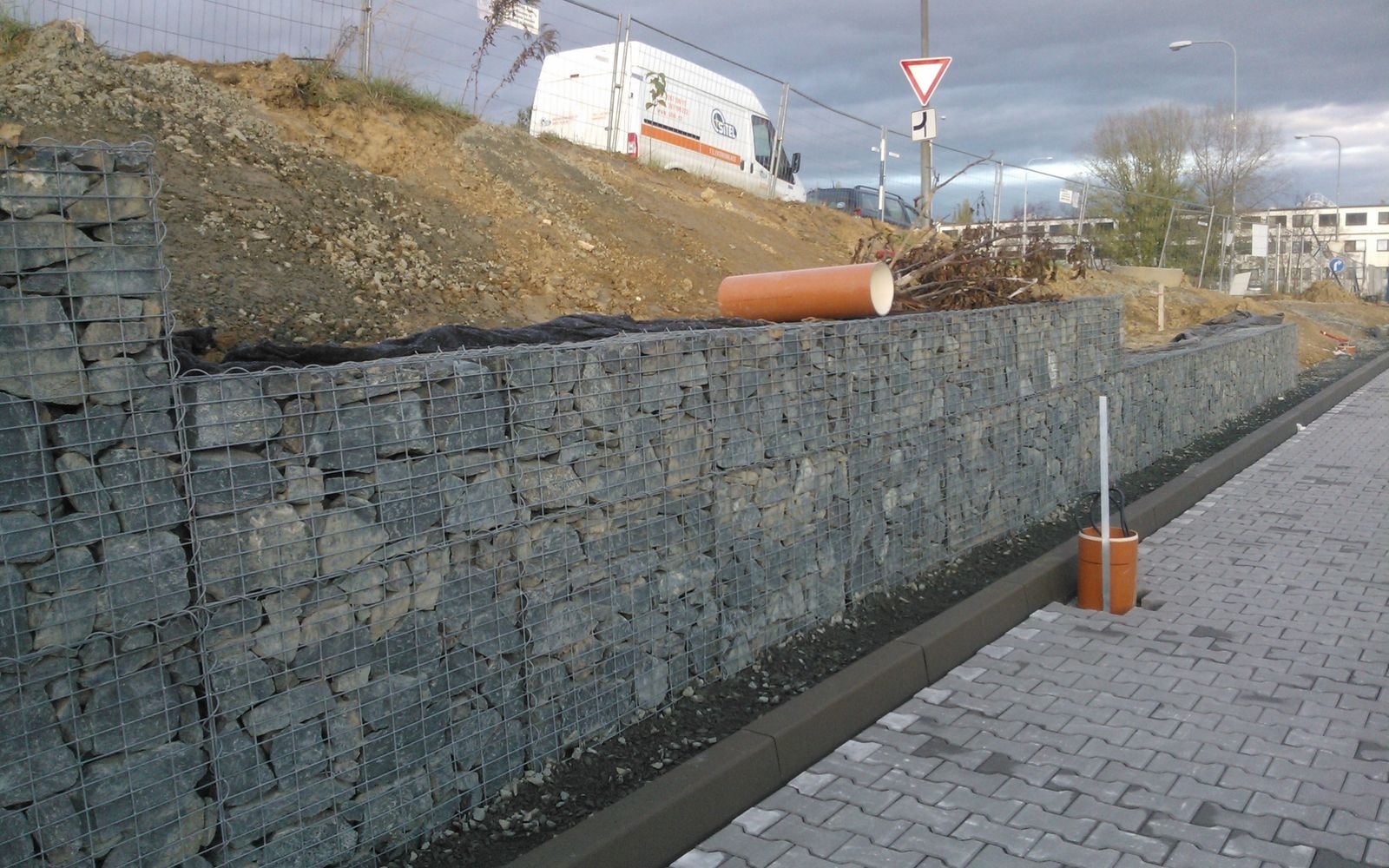 Gabiónový múr v areáli firmy Mercedes, Brno