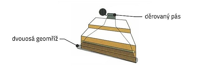 Geotextilie, jakožto tkaniny vyrobené z polymerových vláken se vyznačují velmi malou velikostí otvorů. Při spolupůsobení se zeminou spoléhají na povrchové tření, což je nedostatečné k zabezpečení laterálního zadržení částic výplně pod dynamickým zatížením, působí tedy jako tahová membrána. Pro zmobilizování pevnosti geotextilie a vytvoření podpůrného mechanismu při stabilizaci musí tedy dojít k její značné deformaci. Naproti tomu geomříže, neboli geosyntetika s otevřenou strukturou, používané v kombinaci se zrnitým materiálem, využívají mechanismu stabilizačního účinku. Žebra tuhých monolitických geomříží jsou v podélném i příčném směru vyráběna s téměř vertikálními ostrými hranami, které vytvářejí záchytné plochy pro zrna zeminy. Příklad takového žebra je na následujícím obrázku.