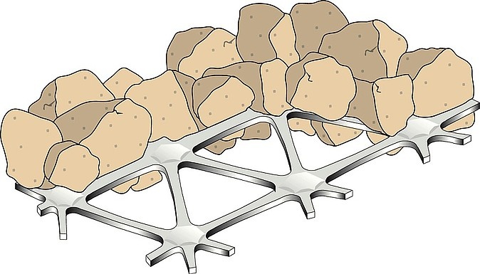 Po umiestnení tuhej monolitickej geomreže do zeminy poskytujú jej rebrá oporu zásypovému materiálu tým, že zrnám vytvárajú množstvo oporných bodov. Výsledkom je, že napätie sa na geomrežu neprenáša iba trením na povrchu, ako je to pri použití geotextílií, ale prostredníctvom interakcie medzi zeminou a geomrežou – pozri nasledujúci obrázok.