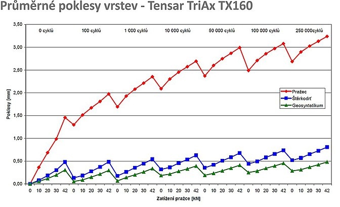 Laboratórne testy na vzorkách stabilizačných geomreží boli vykonané na modeloch pražcového podložia v mierke 1 : 1 s 250 000 zaťažovacími cyklami. Počas zaťažovacích cyklov boli merané poklesy jednotlivých vrstiev a ďalej statické a dynamické moduly pretvárnosti.