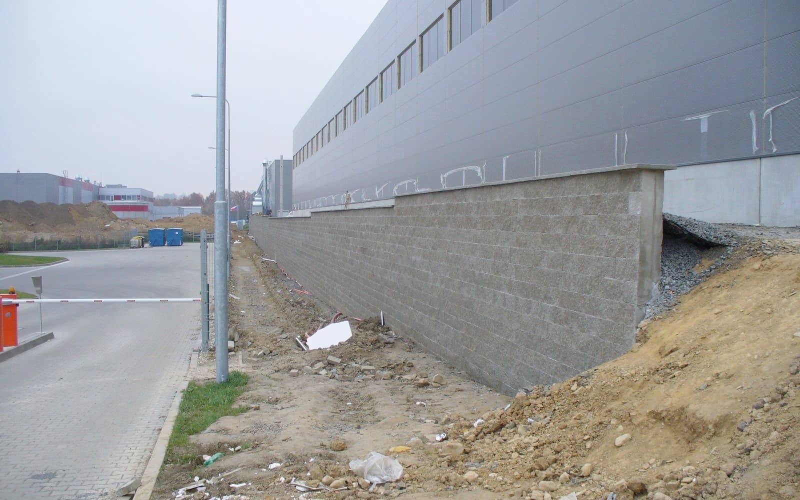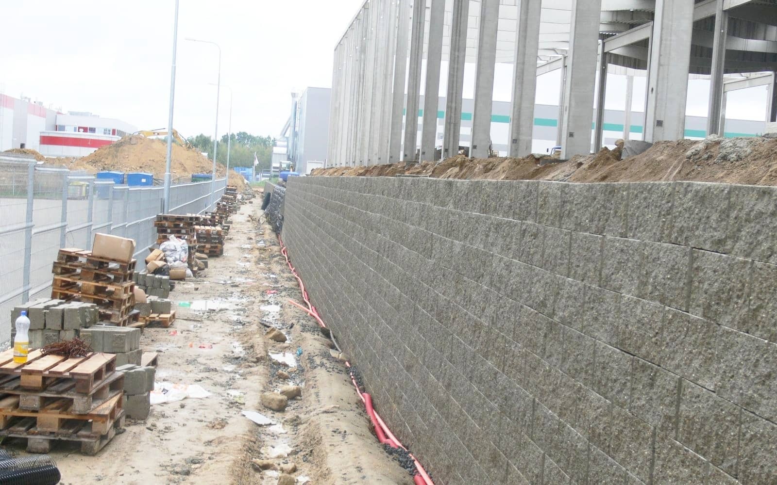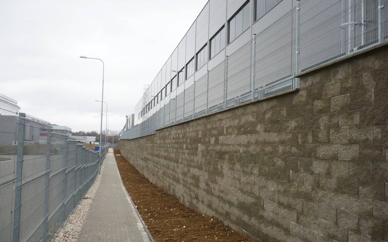 Navrhnutá vystužená oporná konštrukcia pomohla vyriešiť výškový rozdiel medzi projektovanou komunikáciou a novovybudovanou halou.