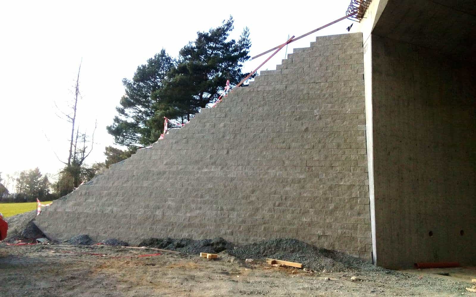 Novo budované mostné krídla sú vytvorené zo systému vystuženej zeminy GeoWall Block. Jedná sa o systémovú konštrukciu s betónovými tvarovkami v líci, ktoré sú prepojené pomocou špeciálnych spojovacích prvkov. Stabilitu a funkčnosť celej konštrukcie zaisťujú monolitické geomreže z vysokohustotného polyetylénu Tensar RE500. Lícne prvky zadržiavajú zeminu zásypu v čele konštrukcie.