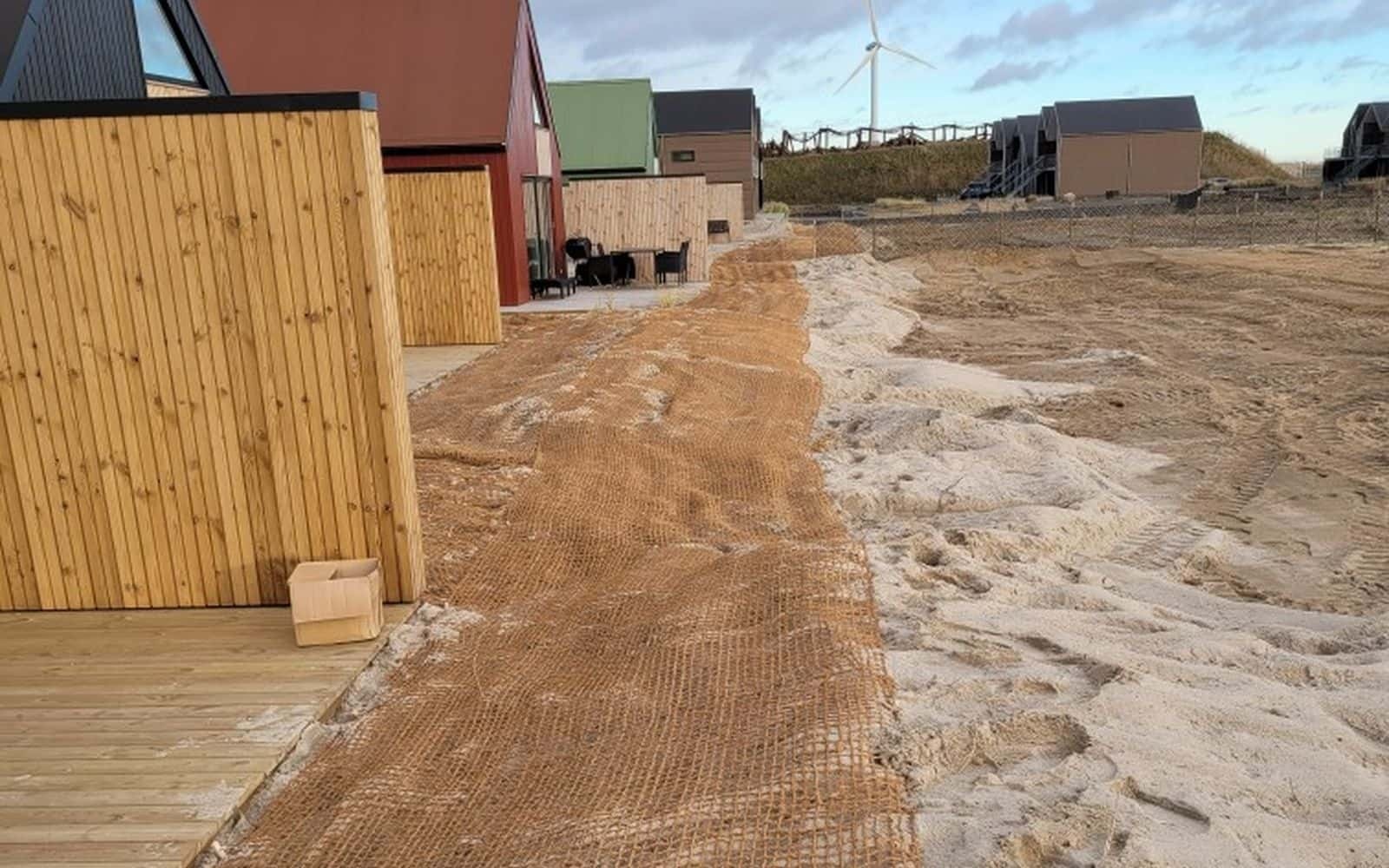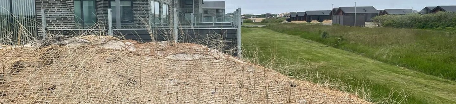 Využitie kokosových sietí ako ochrany proti veternej erózii v turistickej destinácii na západnom pobreží dánskeho Jutska.