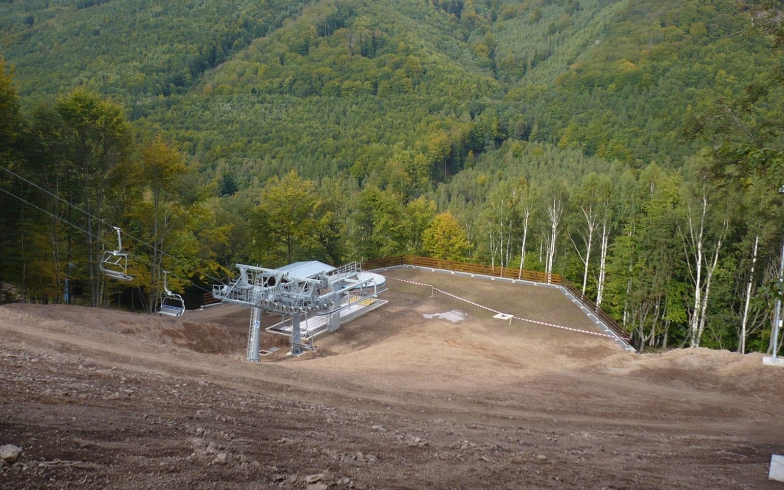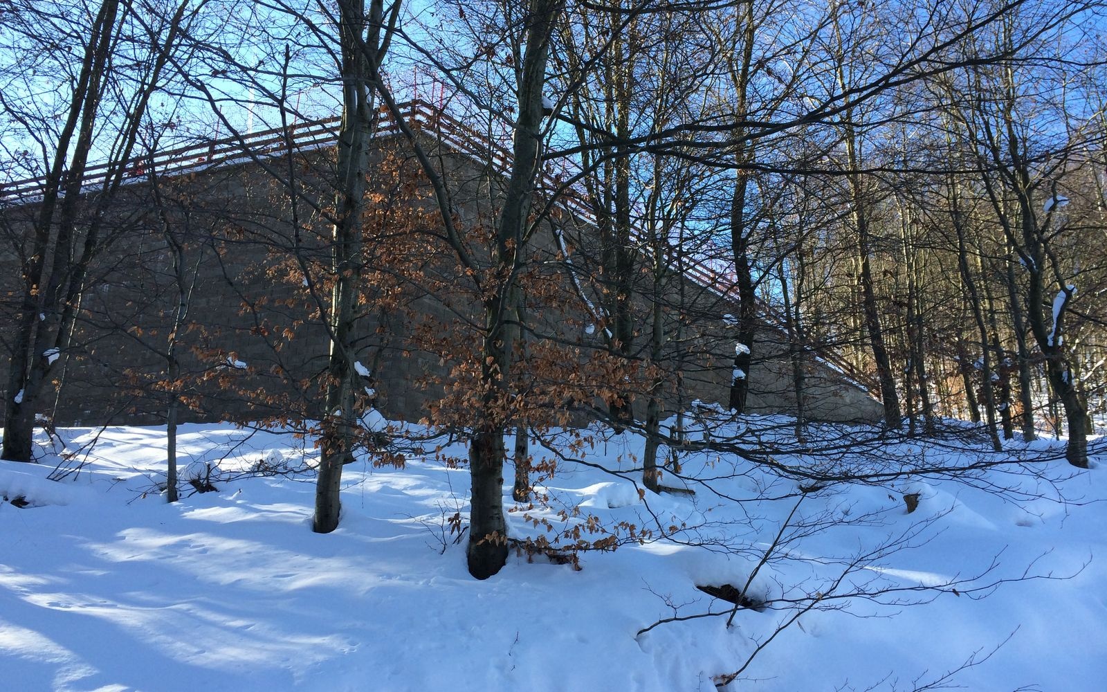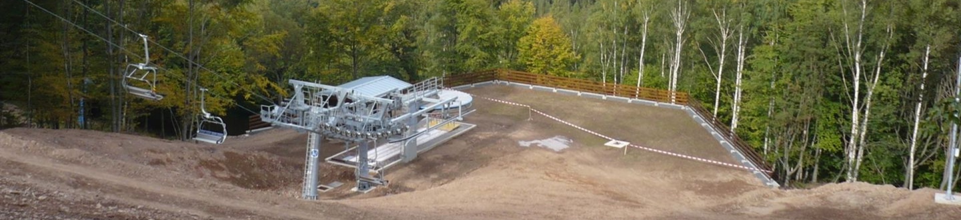 Oporný múr vyrovnávajúci strmý terén stanice lanovej dráhy zjazdovky v Klínech