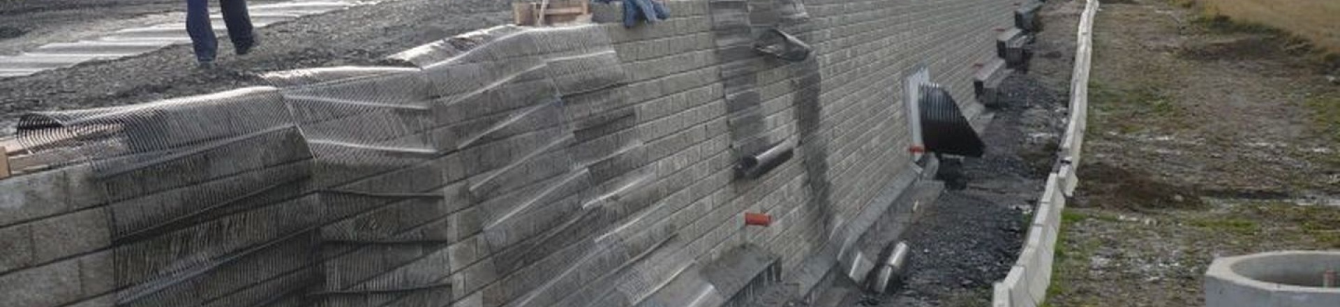 Oporný múr zo systému z vystuženej zeminy a lícom z drobných betónových tvaroviek na ceste I/48 Rychaltice - Frýdek-Místek