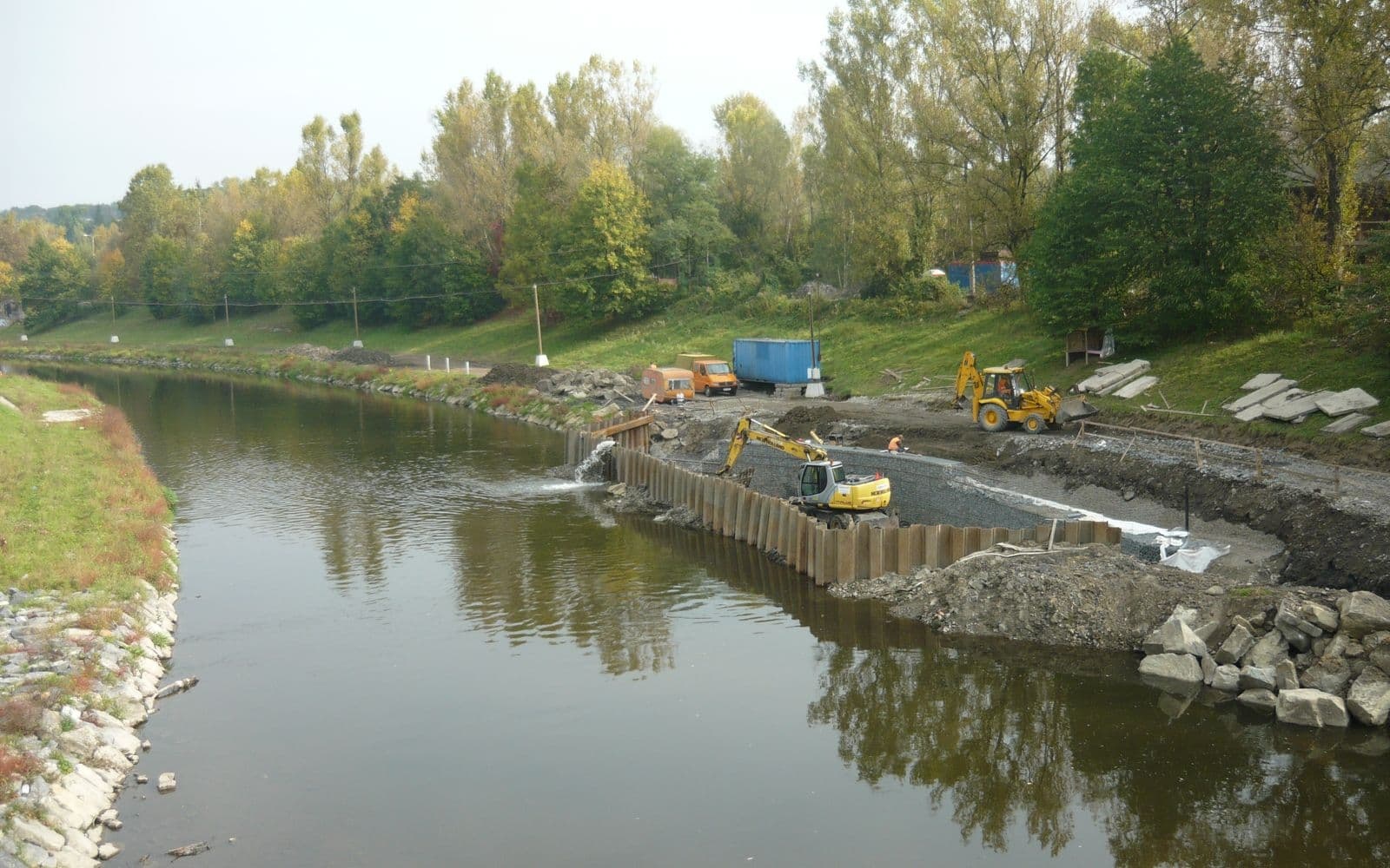 Oprava koryta potoka po povodniach pomocou gabiónových múrov v Závišicích