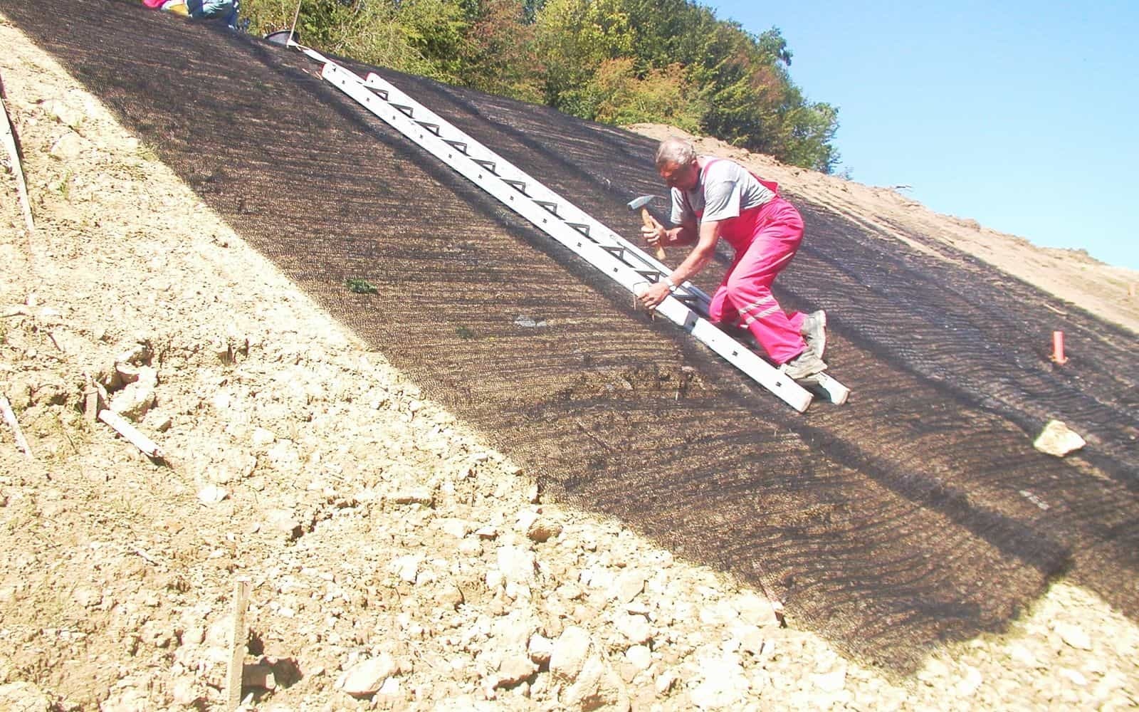 Novo vybudovaný cestný násyp mal taký sklon, že dochádzalo vplyvom zrážok k vodnej erózii. Aby jej bolo zabránené, položila sa pre spevnenie svahu násypu na jeho povrch trvalá protierózna georohož.