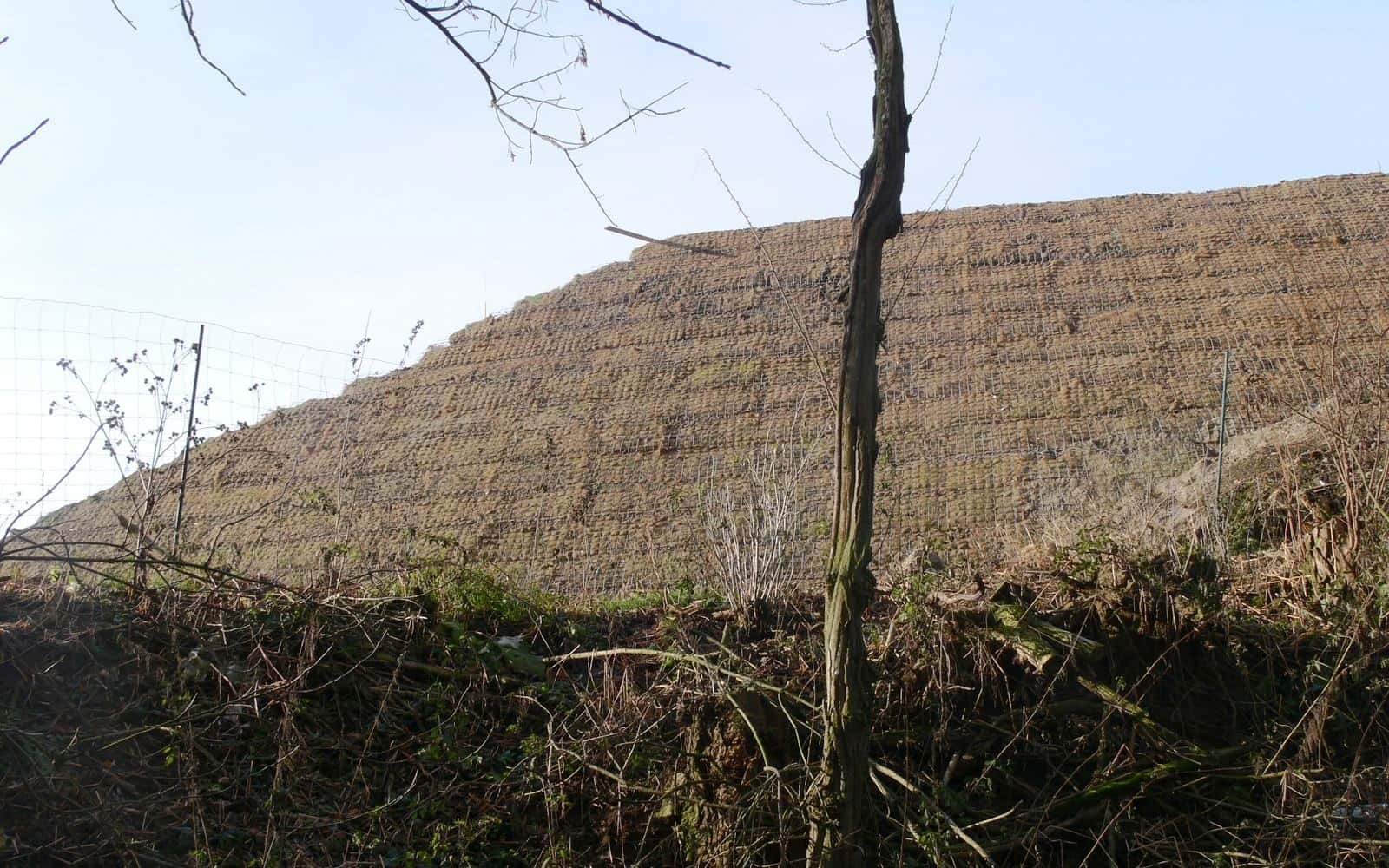 Výstavba strmého svahu z vystuženej zeminy zaisťujúca vyrovnanie pozemku s prevýšením od 4 do 9 m.