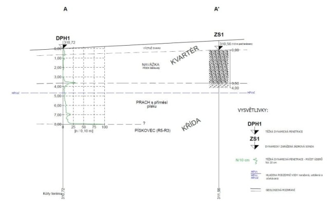 Ďalej sa odobrali vzorky, na ktorých bola stanovená šmyková pevnosť a stlačiteľnosť. Prieskum predpokladal približne 4,5 m hrubú vrstvu navážok, prevažne charakteru piesku štrkovitého (S2 SP) až štrku piesčitého (G2 GP), pod ktorou sa nachádzajú deluvio-eluviálne sedimenty – zmes prachu, ílu a piesku (F3 MS alebo S1 SW). Skalné podložie bolo zastihnuté v hĺbke 8,0 m pod terénom (obr. 3)