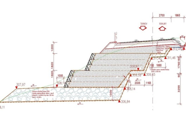 V rámci geotechnického posúdenia bola navrhnutá oporná konštrukcia z vystuženej zeminy so sklonom líca 60° v troch výškových etážach (obr. 6. , ktorá pozostáva z týchto konštrukčných prvkov: