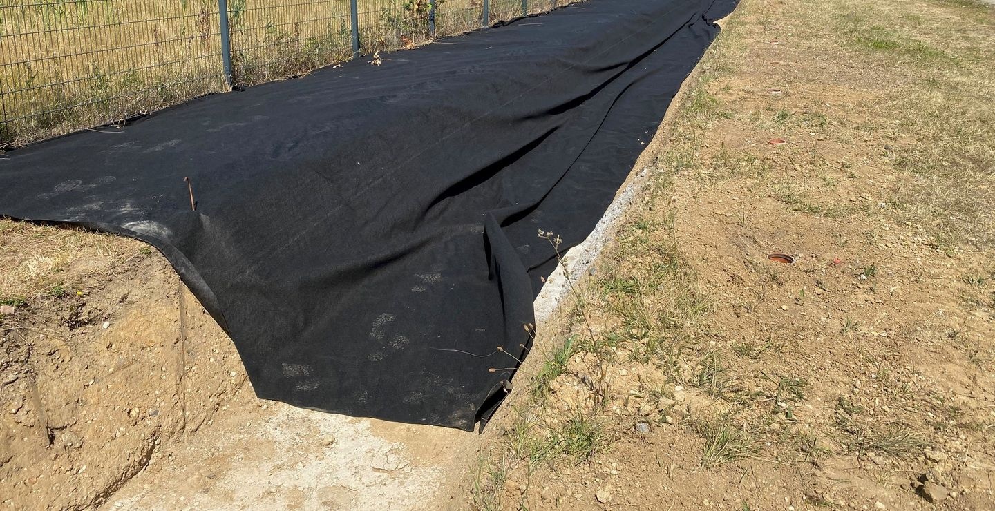 Dostatočne odolná geotextília oddeľuje v nemeckom meste Rötha vo vsakovacom priekope kamenný obklad od pôvodnej zeminy.