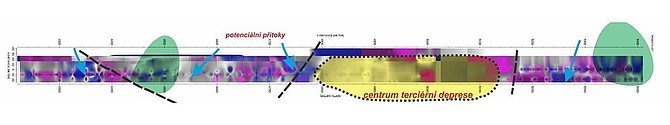 Georadar zobrazujúci zvodnené vrstvy v neogénnych sedimentoch - horizontálny rez h = 3 až 6 m
