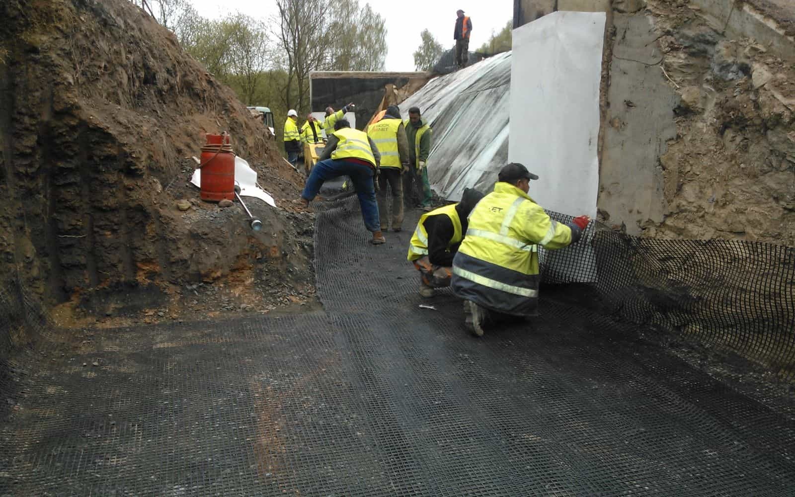 V mieste križovania železničnej trate a pozemnej komunikácie, ktorá je vedená cez drážne teleso pomocou mostného objektu, bolo potrebné vystužiť zemné teleso nad mostom a zabrániť tak deformáciám násypu.