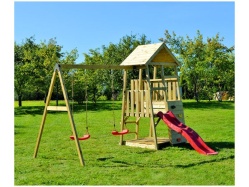 Drevená herná veža Wendi Toys Salamander | vrátane šmykľavky, lezeckej steny a 2 hojdačiek | Natur | 290x340x270 cm