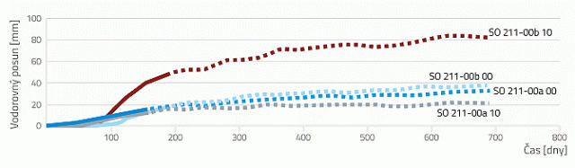 Zvislé deformácie líca opôr (graf na obr. 8) sú pre jednotlivé opory rozdielne. Najnižších hodnôt dosahovalo sadanie líca na opore 211-00a 00, naopak najvyššie hodnoty boli namerané na opore 211-00b 10, a to cca 30 mm. Rozdielne správanie zodpovedá predovšetkým rozdielnym geologickým podmienkam. Vodorovné deformácie (graf na obr. 9) merané v korune panelového opevnenia sledujú pri jednotlivých oporách zvislé deformácie úložného prahu. Maximálnych hodnôt bolo dosiahnuté u opory 211-00b 10. K poslednému meraniu sa hodnoty ustaľujú na hodnote cca 85 mm. Počiatok merania je pre jednotlivé opory vždy vybudovanie násypu za lícnymi panelmi do plnej výšky. Podstatná časť deformácií prebehla u opôr vplyvom priťaženia nosnou konštrukciou mostného objektu a vybudovaním prechodových oblastí a násypového telesa po úroveň pláne. Pri mostnom objekte 211- 00B 10 sa v tejto fáze jednalo o vodorovný posun 55 mm, teda približne 2/3 z celkovej hodnoty doteraz meranej deformácie. Tohto pomeru v rozmedzí od 60 do 70% z celkovej hodnoty vodorovnej deformácia dosahujú všetky opory. Graf na obr. 10 zobrazuje vodorovné posuny jednotlivých oporných múrov v profile vedenom v osi mosta. Je zrejmé, že najvyššie vodorovné deformácie dosahujú opory v hornej časti panelového opevnenia, kde dochádza k najvyššiemu ovplyvneniu vplyvom koncentrácie extrémneho zaťaženia v tesnej blízkosti za rubom opôr. V žiadnom meranom bode však nedošlo k prekročeniu predikovanej hodnoty 93 mm.