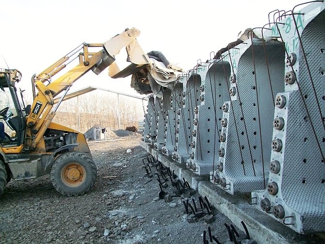 Základové panely boli vykonané striedavo vo dvoch výškach. Po inštalácii výstužných geomreží a zásypu do úrovne nižších panelov pokračovala montáž ďalšími panelmi bez zadných konzol. Po dosiahnutí projektovanej výšky boli za lícom opory vybetónované mohutné úložné prahy (obr. 3), na ktoré boli následne osadené vysoké predpäté spínané betónové segmentové nosníky (obr. 4).